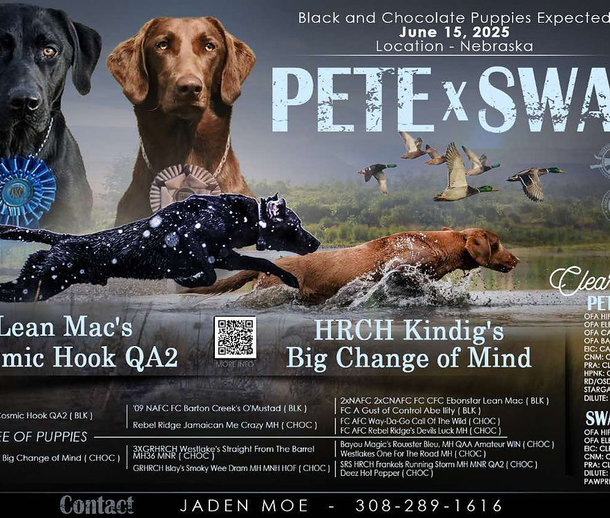 Pete is an 80 pound Black Labrador Retriever who is completely health tested and is standing at stud in Lincoln, Nebraska. He carries chocolate. Pete's sire is '09 NAFC FC AFC Barton Creek's O'Mustad, Call name Hook. Hook needs no introduction. You will not find him in another pedigree this close. Pete is the perfect family companion, hunting dog and competes in AKC Field Trials. Pete's puppies are big, have nice structure, heads and ears. They are absolutely beautiful. Puppies from previous litters are currently serving as family companions, hunting dogs are with professional trainers. Pete was ranked the #42 All Age Amateur Labrador Retriever in just seven trials in the country in 2024. He took a 4th and a Jam in the Amateur earlier this year. Pete was the #22 Derby Dog in the Nation in 2021 with just five trials. He was #28 Derby Dog in the Nation in 2022 with three trials before aging out. He qualified for Derby National in 2021 at 17 months old. He was QA2 in back to back weekends in 2022 at 2.6 years with 6 trials. Pete is currently running All Age and Amateur Field Trials. Pete is a phenomenal waterfowl dog who hunt November through February. (Stats from Retriever Results) He was trained rained by Steadfast Retrievers as a young dog and is now trained by Steenburgen Retrievers. Sway is a beautiful chocolate bitch with a nice pedigree who runs the HRC. She is a HRCH and she hunts as a guide dog in Nebraska. She is a pleasure to have in the blind and in the home. This pairing will produce dogs that can compete, hunt and be your buddy in black and chocolate. They are fully health tested.